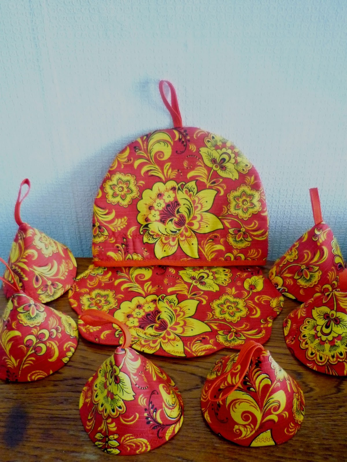 Получился ))) моей самой дорогой заказчице))) яркий комплект на кухню ,состоящий из ланчматов,салфеток под чашечку,колпачков и конечно же тканевых крышечек на баночки.